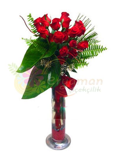 Camfanus içerisinde 9 adet birinci sınıf gonca kırmızı güller, cipso antoryum yaprağ aşkmerdivani ile birlikte tasarlanmış çok şık bir tasarım.