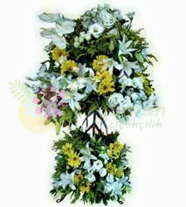 Beyaz kazablianka, sarı gerbera ve yeşilliklerden oluşan, açılış, düğün, nikah, kokteyller için ideal bir tasrım.