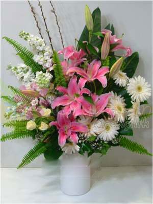 Seramik vazo içerisinde lilyum-gül-şebboy