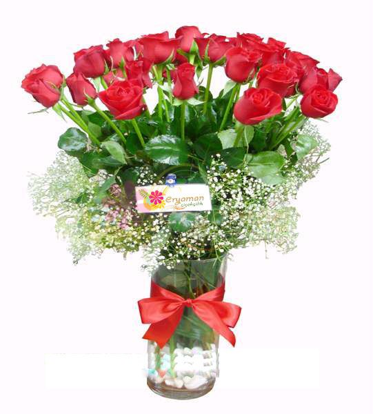 Ürün Kodu: EC407 Cam Vazo İçerisinde 25 Adet Kırmızı Gül